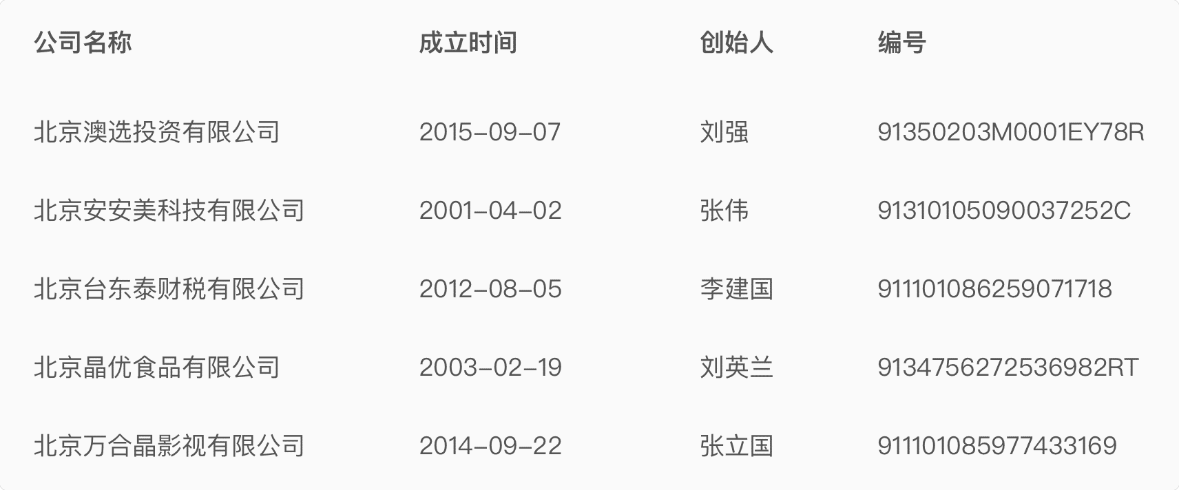 | 公司名稱 | 成立時間 | 創始人 | 編號 |